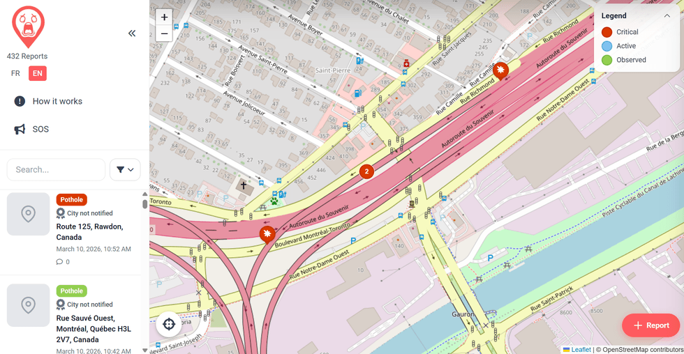 The result’s Ayoye.ca, a free bilingual map the place Montrealers can report and observe street hazards in real-time. Gagné co-founded the positioning in mid-February, and the idea is easy: go to the positioning, pin the precise location of a pothole, add a photograph, and let the neighborhood do the remaining. Different customers then vote on whether or not the report is correct or nonetheless lively, and the system mechanically updates a pothole’s standing to “resolved” as soon as the street has been repaired.